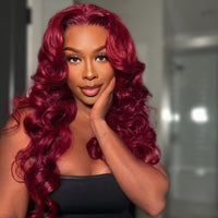 NEW (Requires minimum 7-10 days for customization) Discover our stunning red-burgundy body wave wig, featuring rich, multidimensional hues and voluminous waves. Crafted for elegance, this wig offers texture and shine. To maintain its beauty, handle with care, wash with cold water, and air dry. Enjoy effortless style and confidence with this captivating piece.
